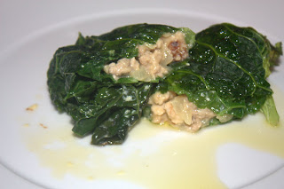Prendete la verza, dividetela in foglie e dopo averle lavate con cura, fatele appassire in poca acqua bollente per circa 5 minuti. Mettete le foglie ad asciugare su un telo da cucina. Intanto preparate la farcitura. Fate imbiondire la carne di maiale macinata in poco olio extravergine d'oliva, con la cipolla tritata. Quando sarà ben rosolata, bagnate col vino bianco e lasciate evaporare. Aggiungete l'uva passa e spegnete. Quando si sarà freddato il composto aggiungete l'uovo e il parmiggiano e ammalgamate il tutto. Farcite, quindi, le foglie con il composto e arrotolate a mo' di involtino. Cuocete in forno per circa 15 minuti a fuoco moderato